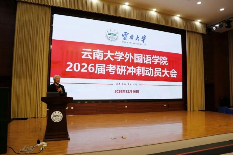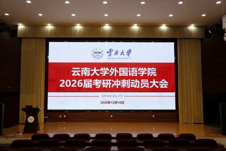 2025年12月16日,云南大学外国语学院举行2022级考研冲刺动员会,旨在为即将参加全国硕士研究生招生考试的大四学子提振信心、传授经验、传递温暖。学院党委书记唐国锋老师、学院院长刘树森老师、学院党委副书记何淼淼老师,2022级专职辅导员龙莹老师及全体考研同学参加本次活动。