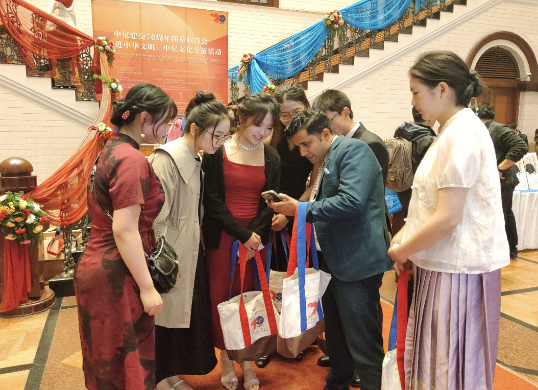 在招待会上,我院同学们以流利的尼泊尔语与到会嘉宾交谈,积极参与文化交流。中国驻尼泊尔大使馆临时代办周攀先生勉励我院同学们珍惜留学的机会,夯实语言功底,未来为推动中尼关系发展贡献青春智慧。