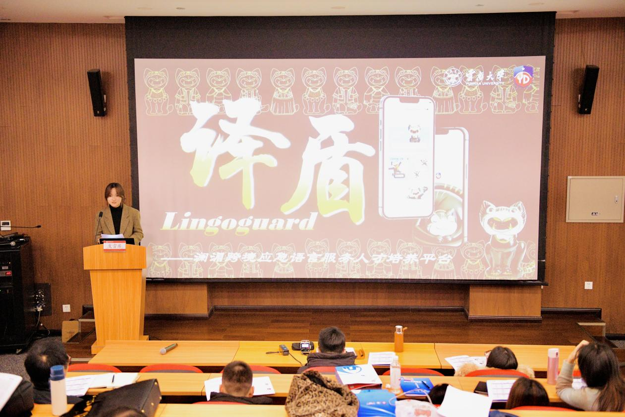 在会议的翻译技术成果发表环节,我院2024级法语专业本科学生杨瑾同学展示了《“译盾”:守护边境安全的应急语言服务卫士》平台。该平台通过建构集“科普、培训、调度”于一体的跨境应急语言服务体系,有效解决了边境应急场景中专业术语缺失、复合型人才匮乏等痛点,用技术手段筑起生命救援的人文防线。