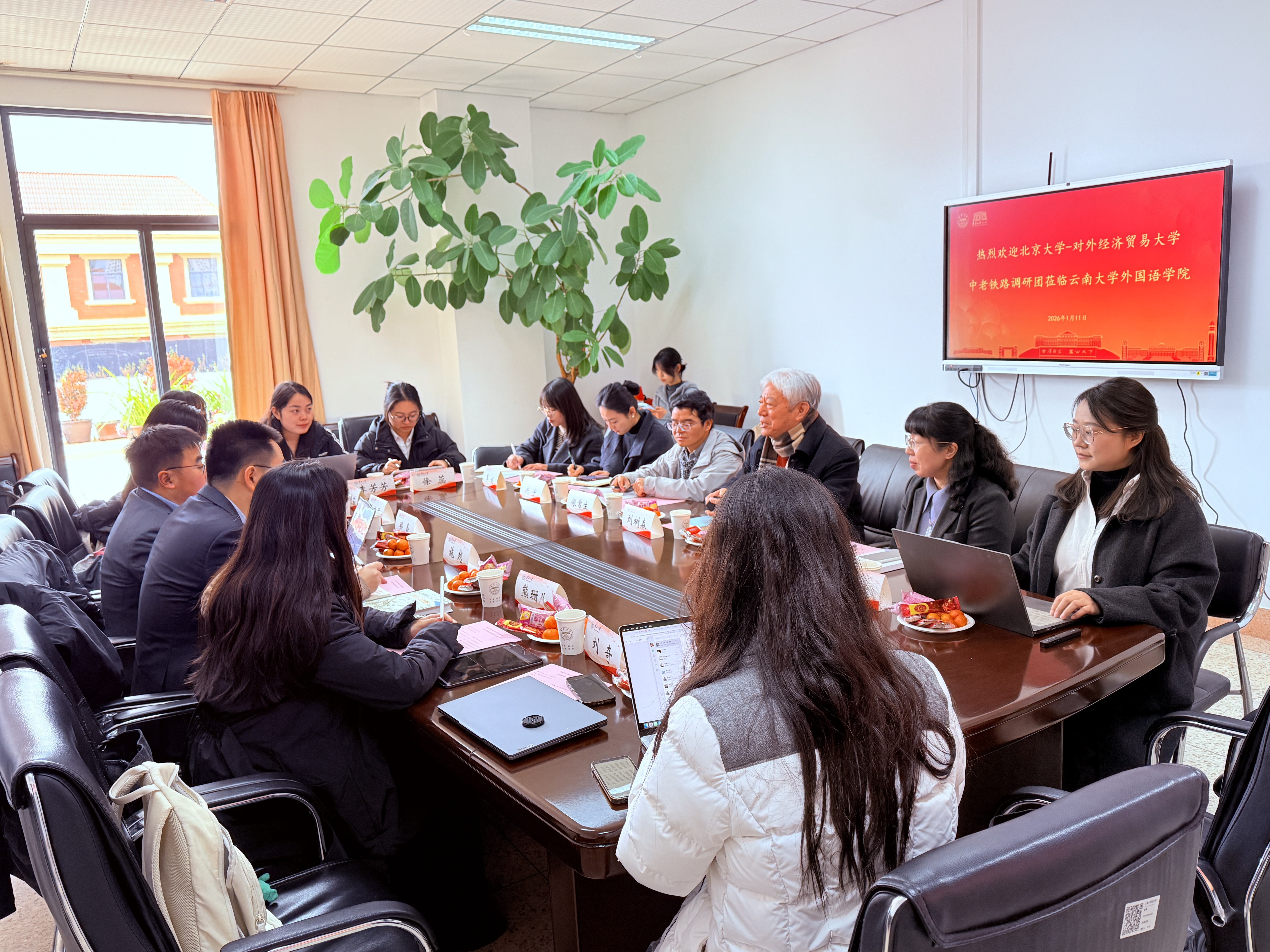 2026年1月11日下午,北京大学-对外经济贸易大学中老铁路联合调研团到访我院。双方围绕“连接全球南方:中老铁路与协同现代化”主题开展座谈交流。北京大学施越副教授、对外经济贸易大学郑豪副教授以及调研团师生与云南大学外国语学院教师代表共同就相关议题进行了深入探讨。