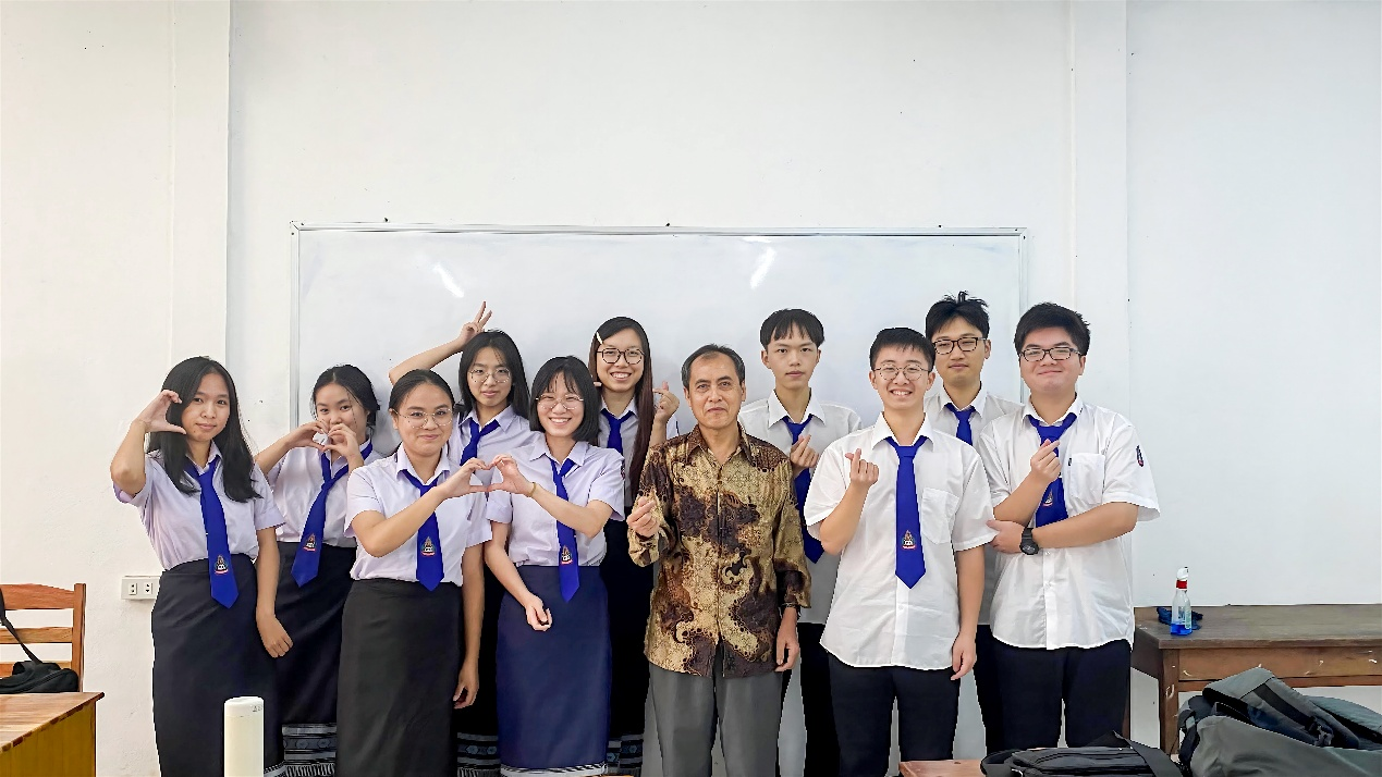 在老挝国立大学全老挝语授课的教学环境中,同学们主动适应、积极融入,从初期课堂互动时的略显拘谨,到逐步能够自信参与课堂讨论、独立完成专题研习任务,大家的语言应用能力不断提升。课堂之外,大家积极与当地学生互动,在日常交往中锻炼口语、交流思想,实现了从“学习语言”到“运用语言”的转变。