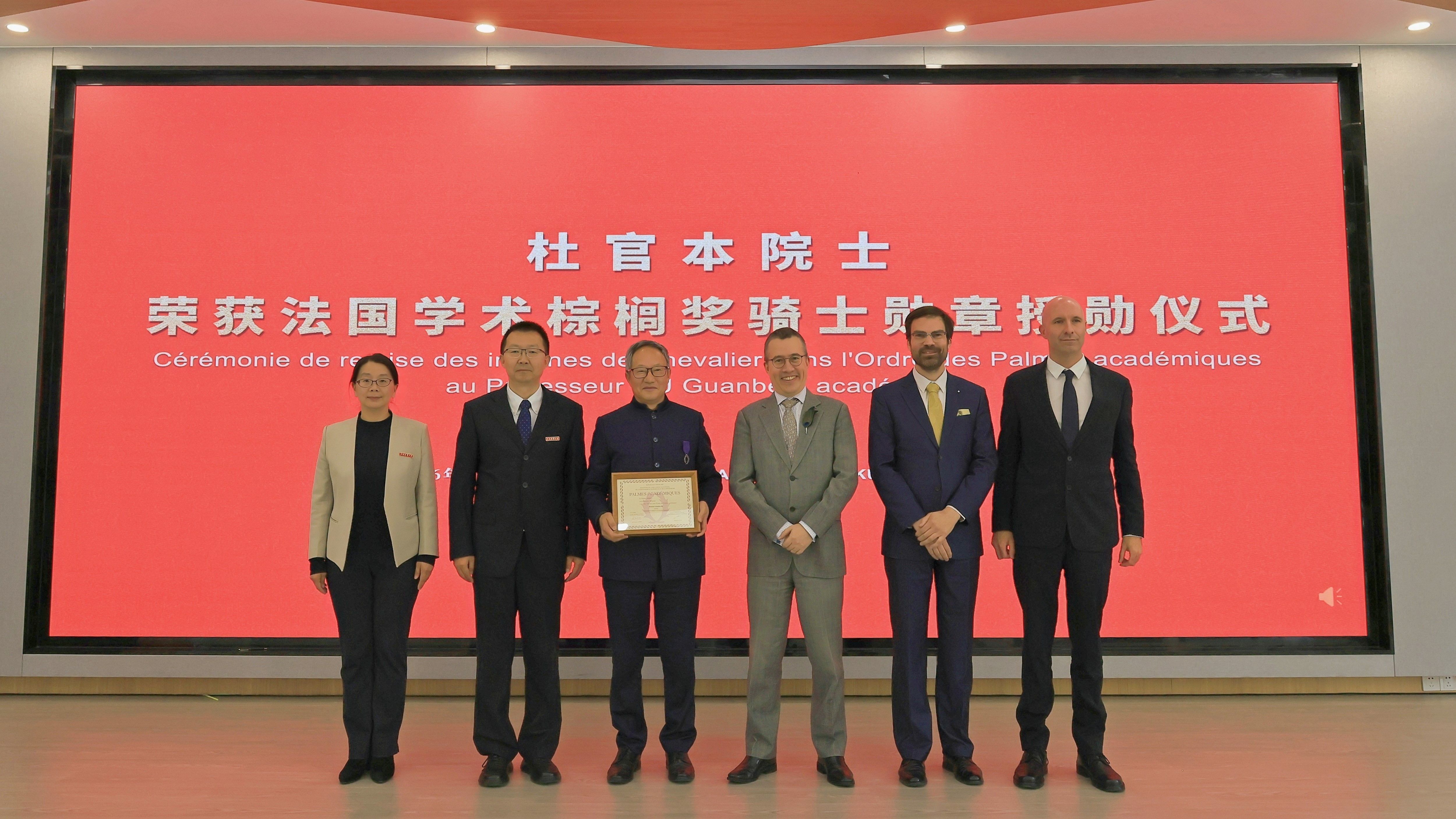 2026年3月16日,我院法语系教师解婷、王天骄、舒湛及法语笔译硕士研究生孔煜辉同学应邀赴西南林业大学,参加杜官本院士荣获“法国学术棕榈奖骑士勋章授勋仪式暨法语活动月”活动。活动现场,中法嘉宾齐聚,多语交汇、人文相映,展现出滇法教育交流的深厚情谊。