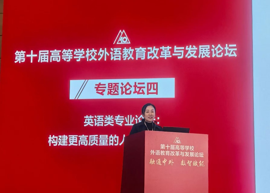 2026年3月21日至22日,第十届高等学校外语教育改革与发展论坛在北京隆重召开。本届论坛以“融通中外,数智赋能”为主题,汇聚了来自全国外语教育领域的两千余位专家学者,共商“十五五”时期高等外语教育创新发展路径。我院教学名师徐志英教授、院长骆洪教授、副院长寸雪涛教授应邀参会。会上,徐志英教授参加专题论坛四(英语类专业论坛)并作专题发言,题为“人工智能时代英语专业学生可迁移能力培养研究——以‘英美文学’课程为例”。